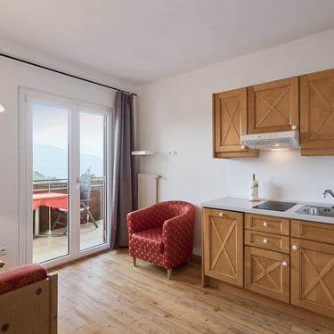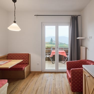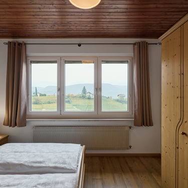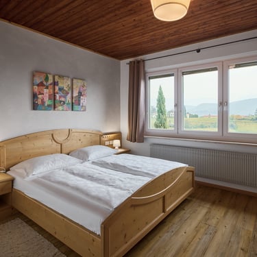 Morgensonne vom Aufwachen bis nach dem Frühstück, Balkon mit Dorf- und Bergblick, getrenntes Schlaf- und Wohnzimmer, jeweils mit Balkonzugang, sowie helles Badezimmer mit Tageslicht.